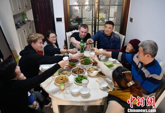 “洋女婿”Liam McCarthy与亲朋举杯贺新春。 刘忠俊 摄