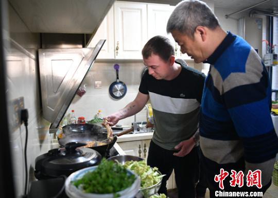 “洋女婿”Liam McCarthy厨房学做水煮鱼。 刘忠俊 摄