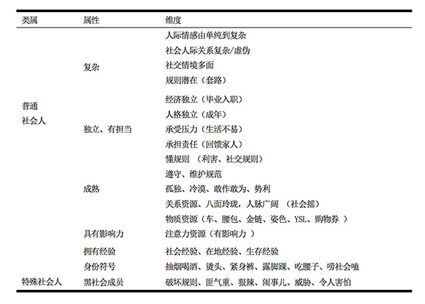 在我们分析的文本中,“社会人”可以分为两类,也就是普通“社会人”与特殊“社会人”。其中前者具有复杂、独立和有担当、成熟、具有影响力、拥有经验等基本特征;后者主要是指某些社会成员,他们抽烟、喝酒、烫头,具有破坏正常规则、威胁、令人害怕等基本特征。