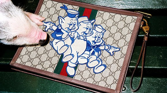 Gucci“猪猪家族”限定款中生肖以经典动画《三只小猪》的形式出现,迪士尼小猪的图案被很自然地放到了品牌Ophidia系列的背包、手提包和钱夹上。Gucci还为猪年独家设计了跳舞小猪的图案,由此图案又衍生了好几件T恤、针织衫等单品。