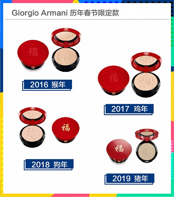 LV 猴年限定系列品牌如果想要有更复杂的层次,就会把“中国红”和生肖这两个元素叠加在一起,尽管这种组合很可能与品牌调性极其不搭。Giorgio Armani就忠实地遵照着这个思路,连续推出了四年大红色包装、印有“福”字的外壳和压有生肖图案的高光粉饼,唯一细微的区别,是“福”字从微软雅黑变成了行楷。