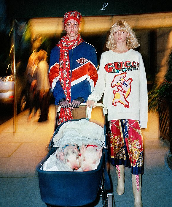 Gucci 2019 猪年限定系列 图片来源:Gucci比较特别的是,Gucci猪年限定款还找来著名摄影师Frank Leban掌镜,在纽约曼哈顿取景,拍摄了一组描绘纽约各界名流在宠物猪陪伴下的生活。这组大片非常Gucci,同时也和猪年主题相扣。