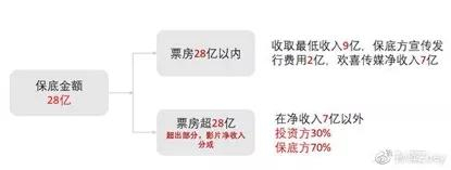 按照公告提供的协议信息,保底方需负责电影的宣传、推广及发行工作及费用,目前预算宣传及发行费用为人民币2亿元,由保底方承担。而不论该电影的总票房收入是超出或低于人民币28亿元,投资方都不会承担宣传及发行费用。若该电影的总票房超出人民币28亿元,按该电影的影片净收入的比例分配:投资方30%,保底方70%。通过这份协议欢喜传媒作为投资方已经提前锁定至少7亿元的收入。