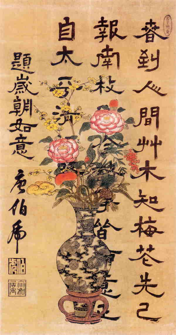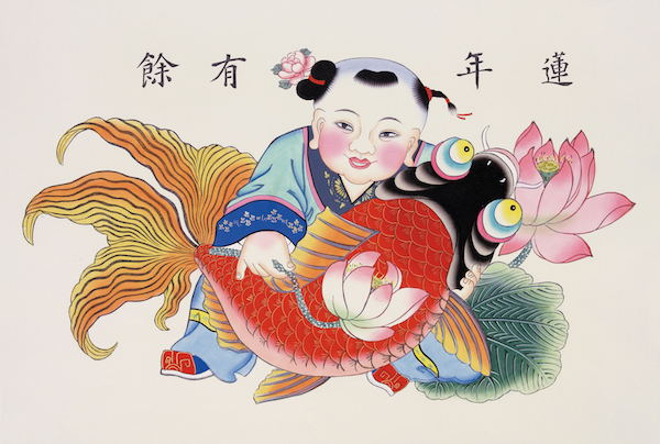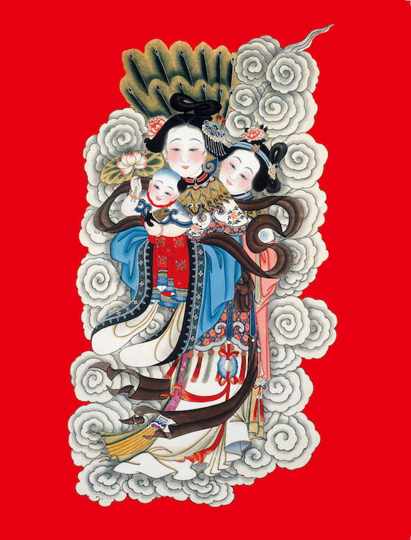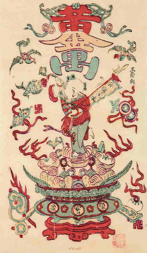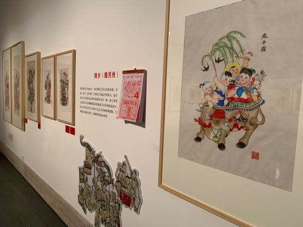 后来过年,人们不满足于门神贴在门上了,也画了许多祈福吉祥的图画贴在厅堂、内室墙上。随着我国雕版印刷技术的发展,出现了木版印制的纸画(当时还不叫年画)。如鹿(禄)、鹊(喜)、宝、蝠(福)、瓶(平安),如财神、福禄寿三星、送子观音、八仙祝寿、和合二仙,如鸡王镇宅、金钱虎、麒麟送子、独鲤朝天、马上封侯(猴),如丹凤朝阳、喜(蛛)从天降、蚕花茂盛、年年有余(鱼)、老鼠嫁女,如一团和气图、二十四孝图、岁朝图、百子图、耕织图。还有许多反映敬天法祖、忠孝传家的伦理美德,历史和戏文故事,风景花卉、仕女婴戏,以及民众生活的年画。出现了全国著名的木刻年画基地,如河南朱仙镇、苏州桃花坞、天津杨柳青、四川绵竹、山东潍坊杨家埠等,以其题材丰富、线条优美、色彩鲜明、画面喜庆等特点,成为历史上木刻年画的不同流派。但“年画”的名称直到清代道光年间才第一次正式出现,笔者小时,苏州人称年画为“画画张”,民国年间在上海出现一种新的年画形式——月份牌年画,“年画”一词才普遍流行开来,为人们广泛沿用。