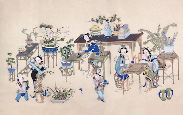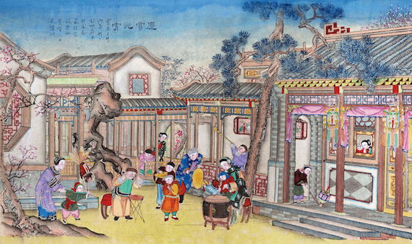 旧时年俗中的年画角色,如腊月廿三、廿四起,厅堂里挂众神图,或“三堂”“五堂”,也称神轴;廿四夜送灶神,“民以食为天”,古人理念灶神是执掌全家饮食的“一家之主”。正月初一,又称岁朝,有“展先像”的习俗,“先像”就是祖先的画像,民间俗呼“喜神”,清代康乾以后时兴在厅堂挂历书瓶花图。公历2月4日立春日,挂芒神春牛图,附年历并注明24个节气。正月初三,拜家堂,还要接灶神,也有人家早在除夕夜就将灶神接回家,或直到正月十五才将灶神接回。正月初五,苏州民间有“接路头”的习俗,视“路头”为地方财神,也祭祀财神赵公元帅。正月初五为小开市,初十为大开市,商家贴“开市大吉”“黄金万两”图。正月十三祭猛将,猛将是民间的驱蝗神,这一天还是元宵灯节上灯之时。正月十五元宵节,是一年之中第一个圆月之夜,古人称上元节、元夜、元夕,“正月里来闹元宵,家家户户挂红灯”,到十八才落灯。年画有灯画类,苏州人家在厅堂挂“天官赐福像”“三官神像”“天官五子图”。新春年节,苏州人都喜欢上街看新年景,人头攒动的地方要数观前街的玄妙观,玄妙观里三教九流,杂耍娱乐活动丰富多彩,三清殿几乎成了一个书画市场,吸引了无数选购年画的市民和农民,“三清殿里看画画张”更成了孩子们的向往。