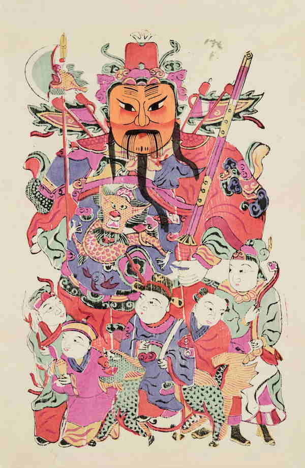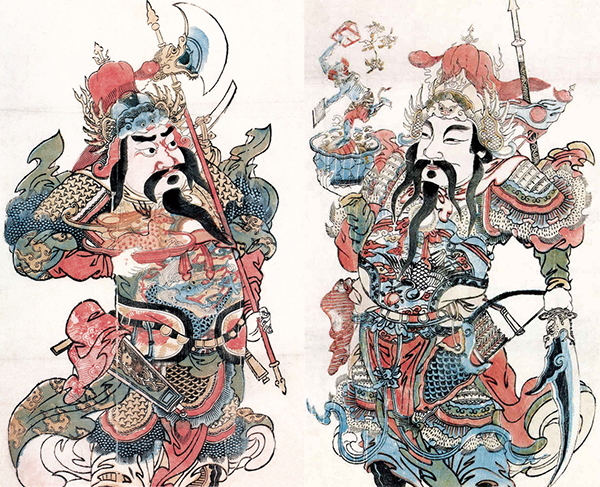 年画最古形式是门神,最早的司门之神传说是神荼和郁垒兄弟二神,在汉代还有画虎或鸡于门上,并将苇索悬于其上的习俗。《山海经》说:东海之中有一座风景美丽的度朔山,山上有一棵巨大无比的桃树,盘曲方圆3000多里,这棵桃树的东北枝叫鬼门,守门的神荼、郁垒是万鬼的统率,如果发现有害人之鬼,就用草绳捆起来喂老虎。南北朝梁朝的宗懔《荆楚岁时记》:“新年门旁设二板,以桃木为之,而画神荼、郁垒像,以压邪,谓之桃符。一年一换,故以为新年故事也。”到了唐代,由于唐太宗李世民的推崇,门神的形象转变为手持钢鞭的尉迟敬德和手持铁锏的秦叔宝,唐玄宗(唐明皇)时代又有百代画圣吴道子所绘的钟馗像。门神的形式随着时代、地域的变化而变化。