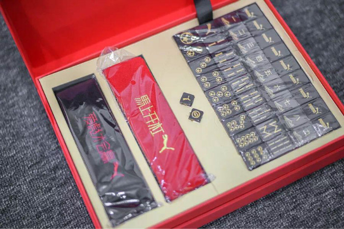 PUMA虽然不是什么买不起的大牌,但贵在用心,今年的媒体赠礼也是麻将。一个红色大盒子打开之后,左边是两条头带,“马上开杠”、“爱彪才会赢”既有品牌关键字,又有美好寓意,一看设计上就下了不少心思。麻将牌的背面是 PUMA的logo,正面的“万”用了鞋来代替,“条”用的是鞋带,“筒”用的是足球,其它花牌也都有各自的创意。