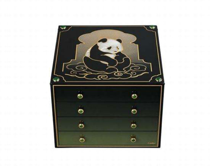 作为“皇帝的珠宝商”,卡地亚的麻将也做成了珠宝盒的形式。墨色漆面的无花果木,镶嵌了珍珠母贝,细节的部分还有镀金描边。中心图案采用中国国宝大熊猫的可爱形象,熊猫驾祥云,要说献礼中国,这才算有诚意。整个礼盒还镶嵌了16颗凸圆形软玉,很有古典气质。全球限量发行18套,售价约45万元。