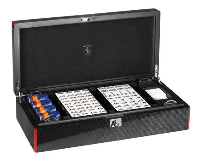 法拉利也出过麻将。麻将盒非常有本家超跑的感觉,黑色碳纤维盒子,配上红色的描边,还有一颗小小的法拉利Logo在盒面上。 法拉利的麻将牌面还比较正常,至少花色上传统的颜色都有。筹码和骰子都非常有马拉内罗(法拉利总部所在城市)的风格,售价约:1500 欧元。