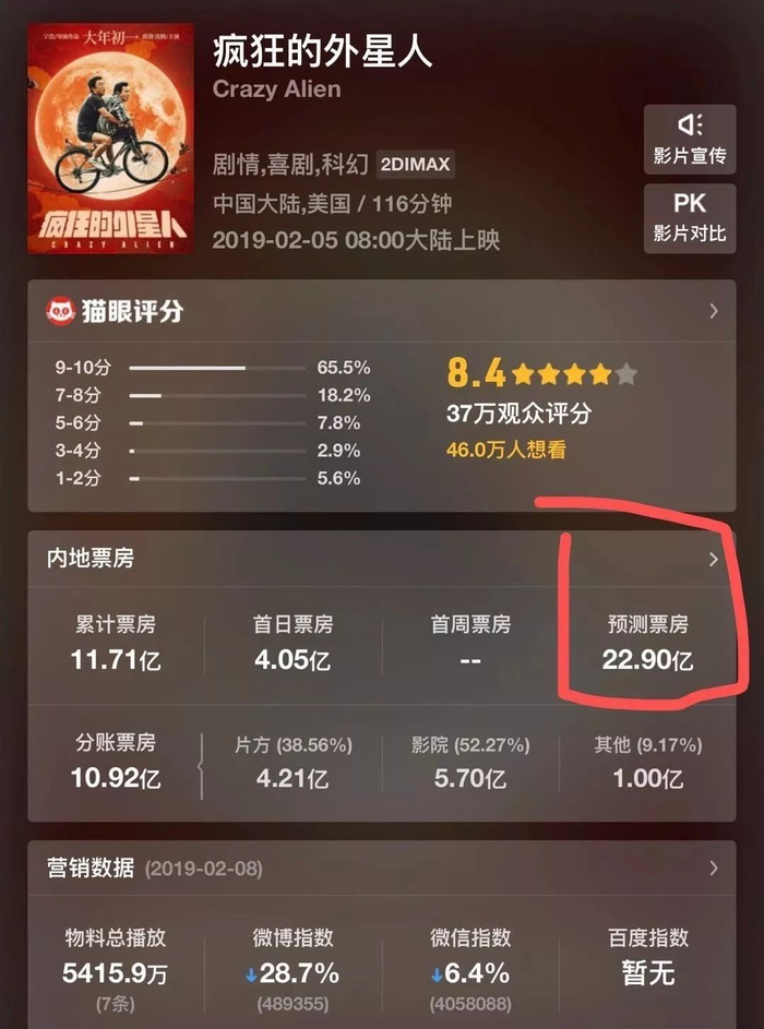 截至2019年2月9日11时许,《疯狂的外星人》总票房11.7亿元。近日,其豆瓣评分已经从最初的7.2分下跌至6.6分,不少网友在观影之后表示失望。评分下滑的同时,该片预测总票房也由最初的30多亿元下滑至22.9亿元。