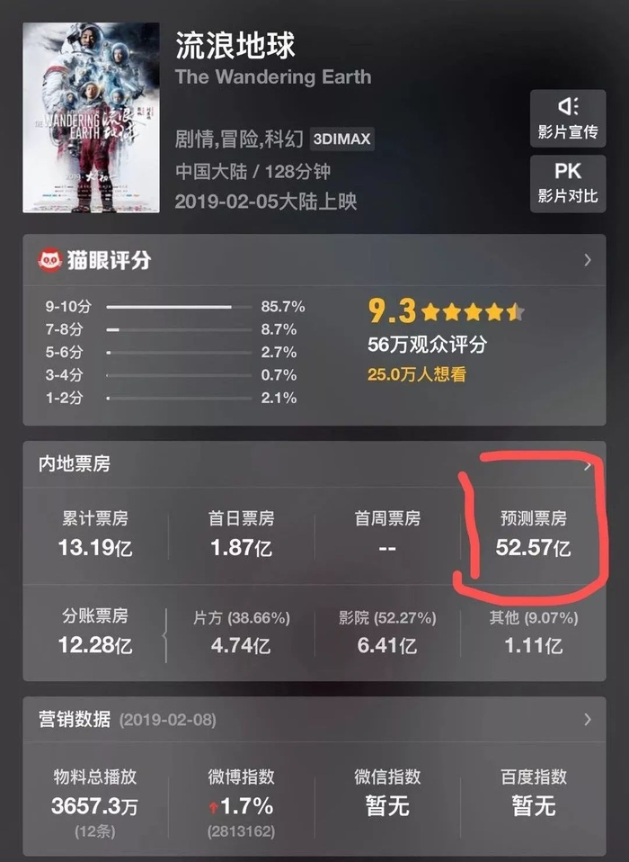猫眼预计,《流浪地球》最终票房将超过52亿元。
