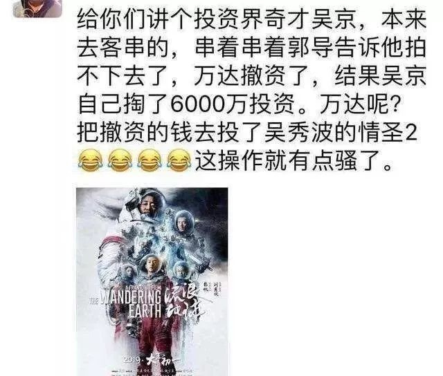事实上,吴京实际控股的登峰国际文化最终选择投资6000万元,这对《流浪地球》的诞生起到了关键作用。《流浪地球》上映当天,导演郭帆特意提到,“没有吴京,就没有《流浪地球》的诞生”。