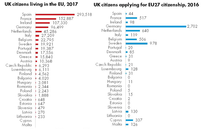 德国是目前最受英国人青睐的欧盟内移民地。德国内政部公布的声明称,在无协议脱欧条件下,英国人将可以保留三个月的居住权。同时只要在德居住的英国人在今年6月底前申请居留权,在三个月期限后还可以申请延期。此外,尽管德国通常不允许双重国籍身份的存在,但还是放宽了英国人获取德国公民身份的规定。