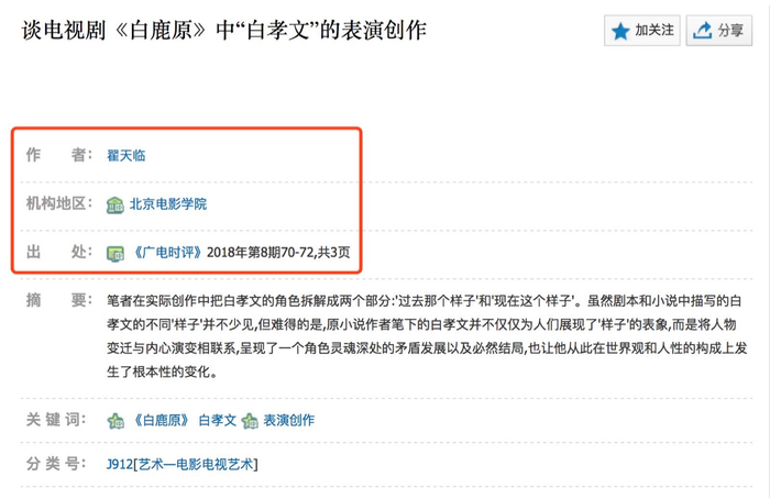 翟天临的《谈电视剧《白鹿原》中“白孝文”的表演创作》,发表于2018年08期,《广电时评》。维普期刊截图