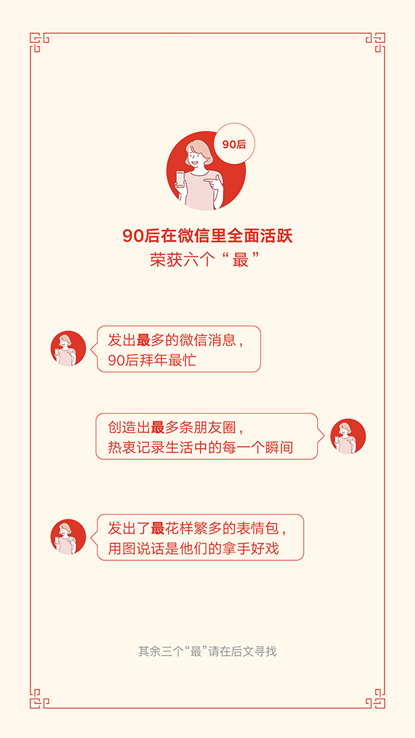其中,90后正在成长为移动互联网世界的主宰,实现了发出最多条微信消息、最多条朋友圈、最多个表情包,以及收发最多次微信红包的“四个最”。