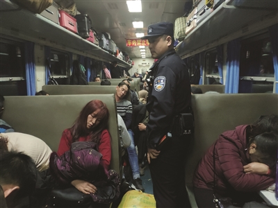 “车上19个车厢满负荷运载,行李多,人员密集,很多人辛苦打了一年工,我们要保卫好他们的财产安全,让他们安安稳稳过个好年。”除了巡视宣传外,张鑫还要下车与车站执勤民警办理交接,一直忙得吃不上饭。车上并没有空调,但张鑫带着10斤警械,巡视一趟后,就像刚吃完火锅,汗水顺着帽檐哗哗淌了下来。