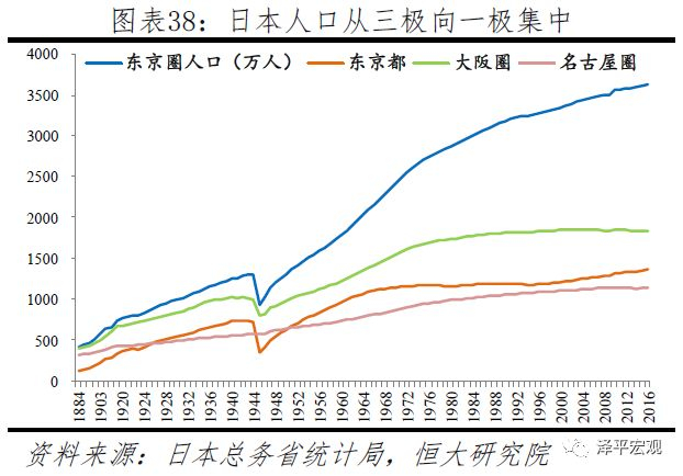 日本人口流动分为两个阶段:在1974年前,全国人口基本持续向东京圈、大阪圈、名古屋圈三极集聚。1884-1973年,除战争影响外,东京圈人口406万人增至2607万人,占比从10.8%增至23.9%;大阪圈人口从392万人增至1636万人,占比从10.5%增至15.0%;名古屋圈人口从311万人增至918万人,占比从8.3%增至8.4%。之后则转为向东京圈一极集中,而名古屋圈人口流入流出基本平衡、大阪圈长期净流出;到2016年,东京圈、大阪圈、名古屋圈人口分别为3629、1831、1134万,占比分别为28.6%、14.4%、8.9%,该时期大阪圈和名古屋圈人口增长主要源于自然增长。东京都人口在1970-1997年人口增长停滞,主要在于东京都区产业转移、人口外迁,但东京都非都区、东京圈三县人口显著增长。