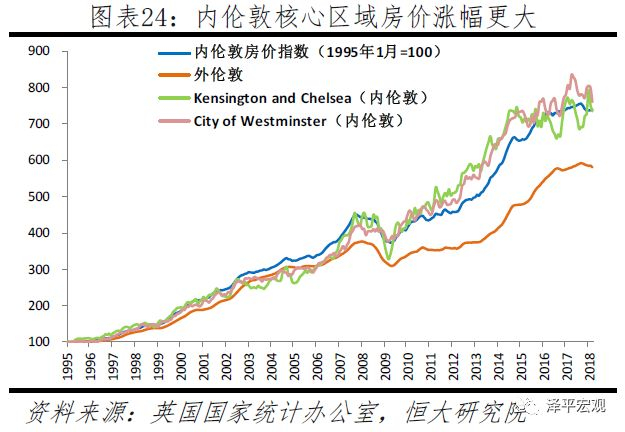 从大伦敦内部看,内伦敦核心区域房价涨幅更大。1995年1月至2018年3月,内伦敦房价从7.83万英镑/套涨至57.9万英镑/套,上涨6.4倍;外伦敦房价从7.30万英镑/套涨至2018年3月的42.39万英镑/套,上涨4.8倍。当前伦敦房价最贵是Kensington and Chelsea(134.36万英镑/套),其次是City of Westminster(101.24万英镑/套),分别较1995年1月上涨6.3、6.6倍。