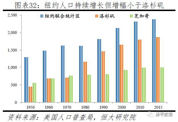 纽约有多重涵义:纽约市、纽约都会区、纽约联合统计区等。其中,纽约市土地面积为789平方公里,2015年人口855万;纽约都会区(New York-Newark-Jersey City Metropolitan Statistical Area,NY-NJ-PA MSA)面积约1.7万平方公里,2015年人口2018万;纽约联合统计区(New York-Newark Combined Statistical Area)由纽约都会区及毗邻都会区组成,2015年人口2372万。从人口看,由于美国经济重心向西海岸、南海岸偏移,1950-2015年纽约地区人口虽基本持续增长,但增幅84%远小于洛杉矶地区的328%,这使得纽约地区的人口占比明显下滑。期间,因人口郊区化及制造业衰退,纽约市人口在1950-1980年从789万减至702万;后因城市更新及产业转型升级等,回升至2015年的855万。