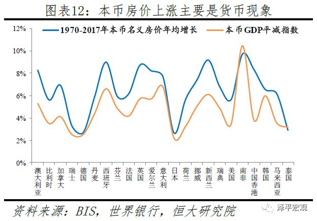 3)货币供应带来的货币幻觉。从国际经验来看,在经济发展过程中,绝大部分国家均存在不同程度的货币超发,从而引起资产价格变化。一般而言,广义货币供应增速高则通胀高。1970-2017年,23个经济体年均GDP平减指数的平均数为4.7%、中位数为4.4%,不仅在绝对水平上与23个经济体房价年均增长的平均数6.5%较为接近,而且波动较为一致。比如,1970-2017年南非广义货币增长474倍,在货币大幅超发下南非名义GDP增长387倍,实际GDP仅增长2.3倍,GDP平减指数增长116.6倍,房价上涨85.2倍;美国广义货币增长25.6倍,名义GDP增长18倍,实际GDP上涨2.7倍,GDP平减指数增长4.1倍,房价上涨13倍。但是,货币超发易滋生房地产等资产价格泡沫,极端情况下甚至可能引发经济危机,比如1990年代日本房地产泡沫和2007年美国次贷危机。