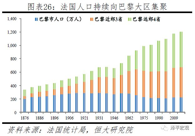 巴黎有三个范围:巴黎市(或称小巴黎)、大巴黎(包括近郊3省)、巴黎大区(包括远郊4省,又称“法兰西岛”),土地面积分别为105、761、12001平方公里,其中巴黎大区土地面积占法国的1.8%。随着产业集聚,法国人口长期持续向巴黎及周边地区集聚,1876-2014年巴黎大区人口从332万人基本持续增至1203万人,人口占比从8.6%提升至18.8%,经济份额从1990年的28.4%提升至2014年的30.4%。期间,出于控制人口以治理大城市病的目的,巴黎市有过较长时间减少,1931-1999年从289万持续降至213万,之后回升至2014年的222万。