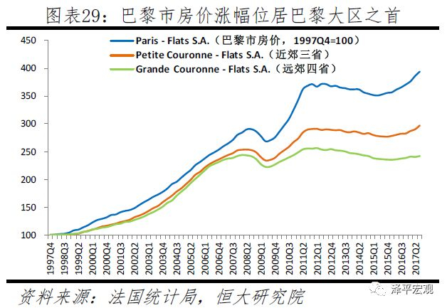 巴黎市房价涨幅位居巴黎大区之首。由于巴黎市土地面积较小(105平方公里),稍大于北京市东城区和西城区面积之和(93平方公里),因此我们不再对巴黎市内部房价进行分析,而是将巴黎市作为巴黎大区的核心区域,分析其与巴黎大区其他区域房价的走势差异。根据法国统计局(INSEE)数据,1997年4季度至2017年3季度,巴黎市房价涨幅达2.95倍,明显超过近郊三省的1.97倍、远郊四省的1.43倍、法国平均的1.38倍,以及该时期法国名义GDP涨幅(0.8倍)。近郊三省Hauts de Seine、Seine St Denis、Val de Marne房价涨幅分别为2.03、1.91、1.88倍。远郊四省Yvelines、Val d‘Oise、Seineand Marne、Essonne房价涨幅分别为1.51、1.50、1.35、1.25倍。