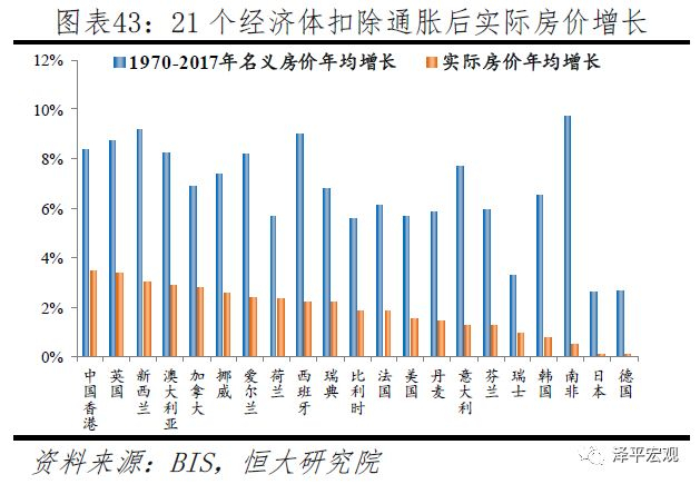 以美元计,1970-2017年21个经济体房价涨幅发生明显变化,且美元房价涨幅与美元名义GDP增长存在一定相关性。如果一经济体货币超发较美国严重,则货币将对美元贬值,因此本币房价大幅上涨并不意味着美元房价大幅上涨,在全球来看并不一定具备投资价值。依据美元房价涨幅,可大体分为四类:一是累计涨幅超过40倍或年均增长超过8%,仅新西兰1个。二是累计涨幅25-30倍或年均增长7%-7.5%,有澳大利亚、英国、西班牙、中国香港、挪威、爱尔兰、荷兰等7个经济体。三是累计涨幅10-20倍或年均增长5%-6.6%,有加拿大、比利时、法国、日本等10个经济体。四是累计涨幅低于7倍或年均增长4.5%以下,有韩国、德国、南非等3个经济体。与本币房价涨幅相比,变化最大的是南非,1970-2017年本币房价涨幅高达85.2倍,但美元房价涨幅仅为3.6倍。此外,瑞士本币房价涨幅仅3.7倍,但美元房价达20.1倍;意大利本币房价上涨34.4倍,但美元房价涨幅缩至11.9倍;德国本币房价上涨2.6倍,美元房价上涨6.5倍。