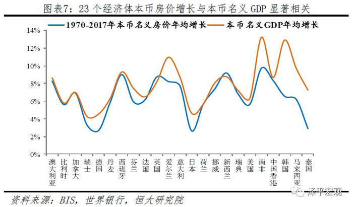 不同经济体本币房价长期走势差异可以解释为四个方面:经济增长带来的收入效应、人口总量与结构变动引起的人口效应、货币供应带来的货币幻觉、住房制度影响的供求格局。房地产兼具消费品属性(居住需求,包括刚需和改善性需求)和金融属性(投资投机需求,并可以加杠杆),因而房价不仅取决于供需(人口及居民收入、土地供给),还与货币供应密切相关。从全球房地产市场运行经验看,在无战争、瘟疫、自然灾害、经济金融危机等冲击的情况下,一国房价随着经济发展而长期上涨。1970-2017年,23个经济体本币房价年均增速、本币名义GDP增速分别为6.5%、7.8%,二者较为接近、且相关系数为0.71;如剔除韩国,22个经济体的相关系数为0.8;如剔除韩国、泰国,相关系数达0.85。名义GDP可分解为人均不变价GDP、人口、GDP平减指数,加上影响供求格局的住房制度,四因素可较好地解释不同经济体房价长期走势差异。
