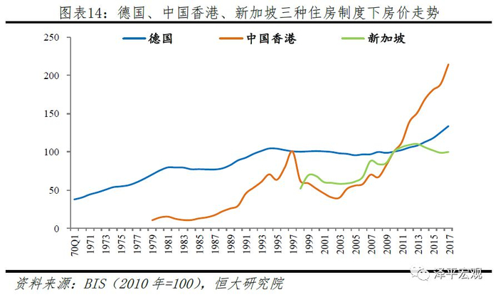 4)住房制度影响的供求格局。住房制度是一国房地产市场导向,一个好的住房制度能使房价长期稳定、支持实体经济发展,一个坏的住房制度可能引发房价暴涨暴跌、削弱甚至掏空实体经济。德国房价之所以长期稳定,关键在于其居住导向的住房制度设计,三大支柱分别为:中性稳健的货币政策与住房金融体系,鼓励居民长期持有住房、打击投机的税收制度,保护租户权益、鼓励长期租房的租赁制度。新加坡目前形成以组屋为主、私宅为辅的二元化供应体系,供给结构呈现“廉租房-廉价房-改善型组屋-私宅”的阶梯化分布,住房自有率超过90%,基本实现居者有其屋。中国香港住房制度则不是一个好的制度,一方面居民居住空间狭小、房价暴涨暴跌,另一方面大量土地未得到充分利用、土地开发率仅24%(敬请关注恒大研究院研究策划半年,近期将重磅推出的德国、中国香港、新加坡、美国、日本、中国等经济体住房制度系列专题报告)。