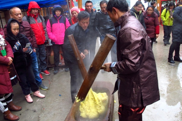 打年粑也是侗族过年必不可少的年俗,年粑就是糯米煮熟后,打成的圆形年糕。不论田多田少,侗民每家都会种一些糯稻,留至过年以备打糍粑用。年耙用来祭祖,招待客人,送礼都要用到。