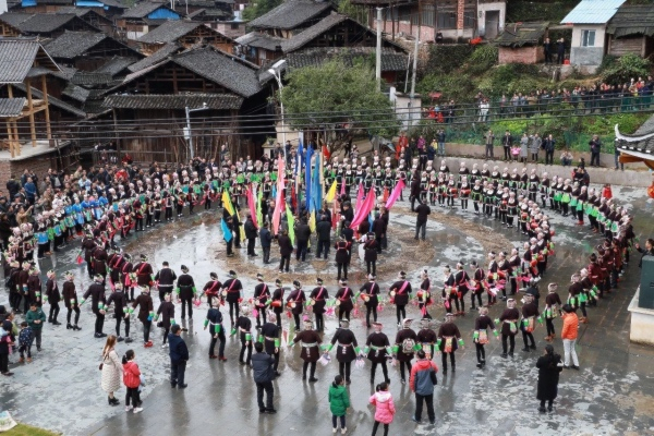 侗年节这天上午,距离佳所侗寨一公里的公路上,自驾车排成长龙。来的人不光是游客,也有各地来过节的杨氏族人和亲友。在佳所“寨门”前,村里的芦笙队,正吹起芦笙,欢迎着四方宾客。盛装打扮的佳所妇女们设起路障,端起酒杯,唱起敬酒歌,寨门旁的匾额,写着“天下杨家”四个字。