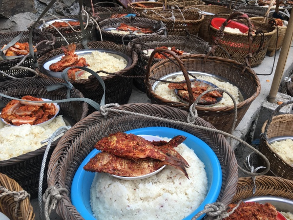 过侗年,最讲究的就是吃。每家都要用最拿手的家乡菜来招待亲友和各方来宾,侗族餐桌上最常见的待客菜有血红、牛瘪、腌鱼、腌肉、白切鸡等等。侗族过年,各家都开有“流水席”,客人随到随吃,有的人家里客人多的会来百多号人,好不热闹。