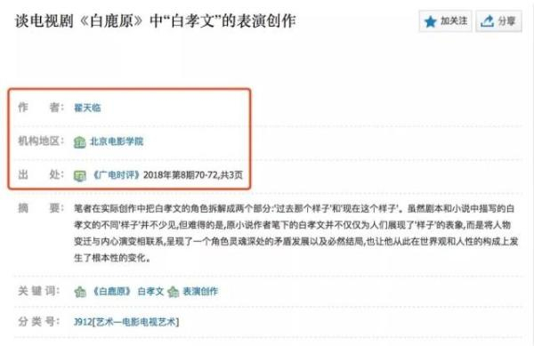 而@ PITD亚洲虐待博士组织 的粉丝们在整个中文知识库中一顿搜刮,也只找到了翟博士署名的两篇文章,其中一篇发在《综艺报》上,实在算不上期刊论文。唯一一篇勉强可能算得上的,是翟博士发表在《广电时评》上的《谈电视剧<白鹿原>中“白孝文”的表演创作》,不到3000字。