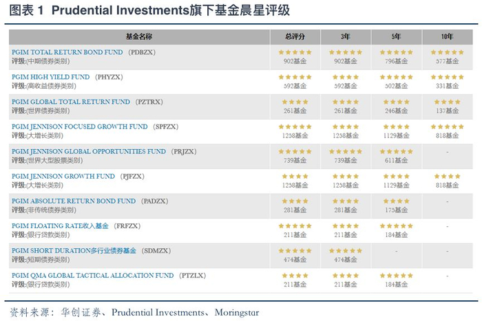Prudential Investments 是美国财富500强公司,其附属公司提供保险,投资管理等金融产品和服务,零售和机构客户遍及美国和其他30多个国家。提供的主要产品和服务包括人寿保险、年金、共同基金、养老金和退休相关投资、行政和资产管理、证券经纪服务,以及美国许多州的商业和住宅房地产。它通过金融服务行业的分销网络向个人和机构客户提供丰富的产品和服务。Prudential Investment在美国,亚洲,欧洲和拉丁美洲开展业务,并将其主要业务组织为金融服务业务和封闭式业务。旗下的PGIM Investments作为PGIM-Prudential Financial, Inc公司全球投资管理业务的一部分主要负责公司的基金管理,管理的共同基金广泛投资于股票、固定收益和房地产行业,全球管理资产超过1万亿美元。
