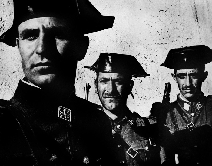 西班牙村庄的民警警卫队在农村巡逻1951