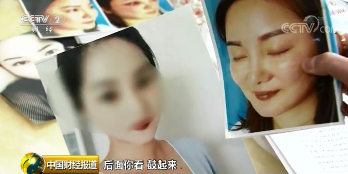 林女士:太阳穴和苹果肌可以捏得出来,像两个鸡蛋、四个鸡蛋挂在那里,硬硬的。我原来的脸是这个样子,后面鼓起来了,她一直跟我说打的是干细胞。