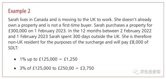 Sarah是加拿大人,于2023年2月1日在英国买了一套房,价格是30万英镑,根据“海外买家税”的规定,Sarah需要支付额外1%,也就是3000英镑的“海外买家税”。