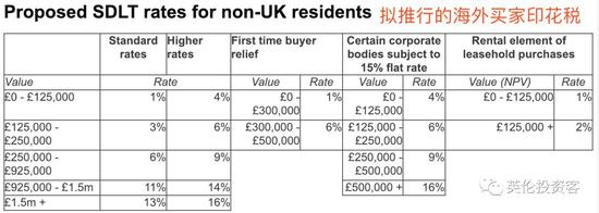 上图为拟推行的海外买家在英国买房印花税率,对比上一个表格,很明显可以看出,对于海外买家来说,每个税档都比过去增加了1%。