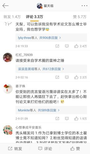 几天之中换了天地,前脚还是刚上春晚的学霸演员前途无量,后脚就陷入了学术不端的漩涡。在翟天临最新一条微博的留言中,不少网友都在求论文求解释。还有粉丝很失望,说:“在脱粉的边缘还有点不死心地徘徊……死磕论文党表示学术不端不能忍。”