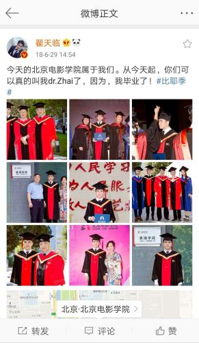 微博截图,翟天临去年获得博士学位