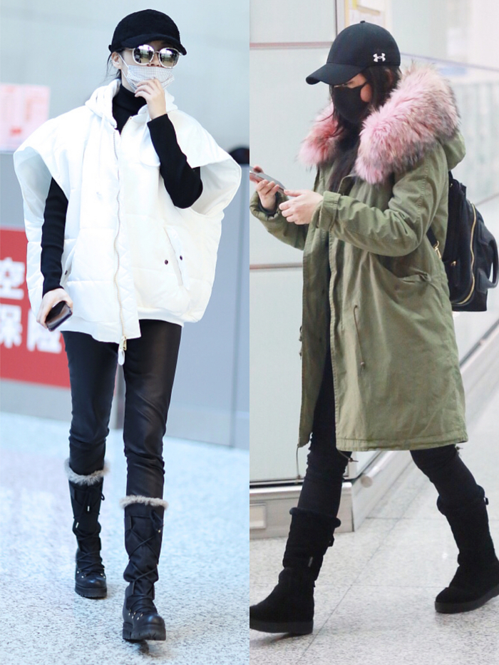 而圆筒的毛毛靴和敞口靴也最容易显臃肿,像左图中的这种夸张的毛毛款,明星可以尝试,一般人,尤其是身高不够的妹子,还是要慎重。外翻敞口雪地靴拍照凸造型容易出错,出街行走容易漏风,实在不是明智之选。
