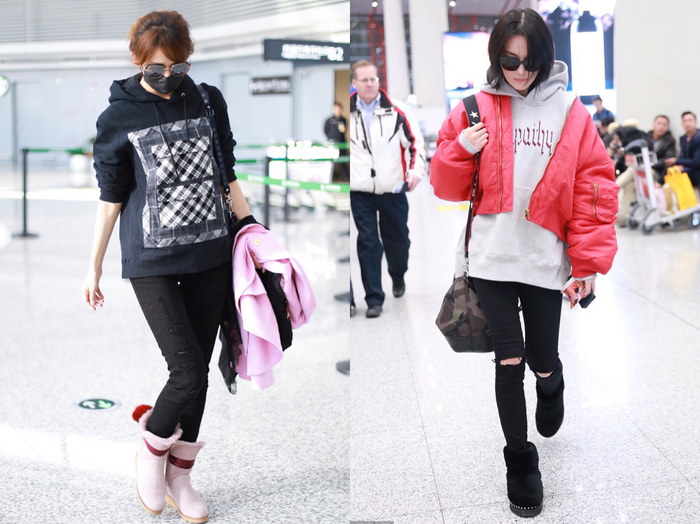 冬天在室内,一件加绒卫衣或帽衫,搭配紧身裤和雪地靴,已经足够了。在整体搭配上,遵循“上宽下窄”的原则不会出错。除此以外,最好让整身穿搭有一个“提亮点”,比如左图上志玲姐姐扮嫩的粉毛雪地靴,再比如右图上张馨予的西瓜红外套,都是减龄的最佳利器。