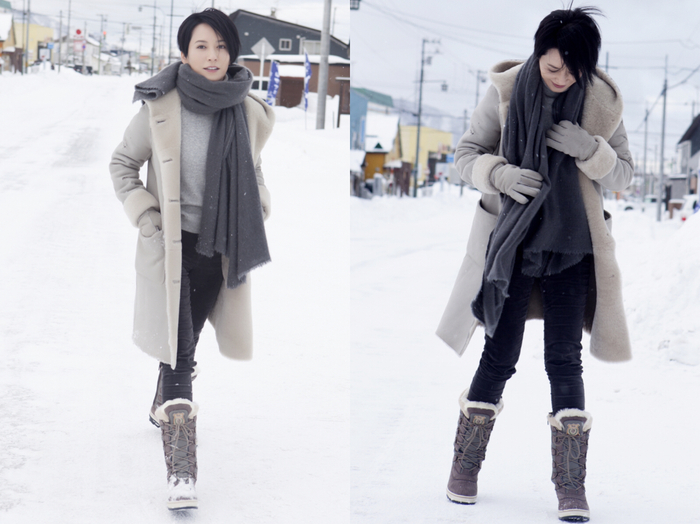 长款羽绒服或棉服、大衣搭配雪地靴,是最好的懒人出行保暖方案。如果想低调,同色系是最保守安全的选择。