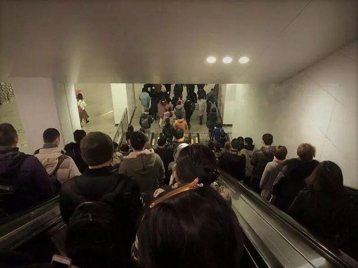 跟林文不同,鱼头换乘地铁不是始发站,高峰期从来见不到空位。当地铁门缓缓打开时,门口已经形成了一堵坚硬的人墙,只能见缝插针地挤进去几个人,排在后面的人只好驻足在门外等下一趟车。最挤的时候,连一个人都上不去,排队的人站满了整个站台,乌泱泱一片人。