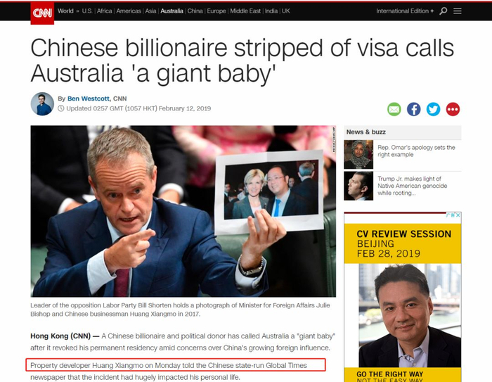 CNN:被吊销签证的华人亿万富翁称澳大利亚为“巨婴”