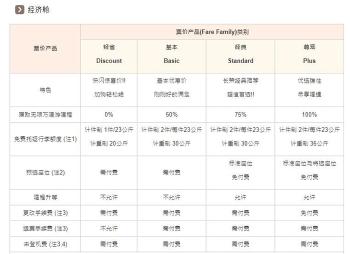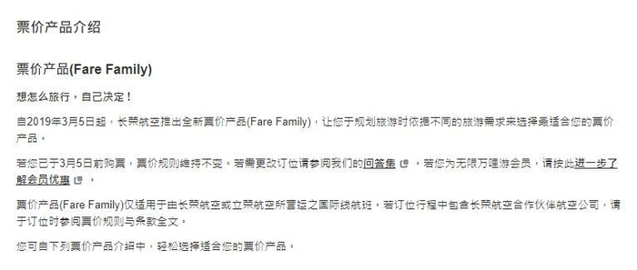 全新的票价产品(Fare Family)上线后,旅客可自行搭配所需要的票价产品,例如希望旅游时有较多弹性与哩程累积的旅客可以选择尊宠(Plus)或经典(Standard),希望有较低的价格并且自己决定是否另外选购附加服务(如预选座位)的旅客可以选择基本(Basic)。