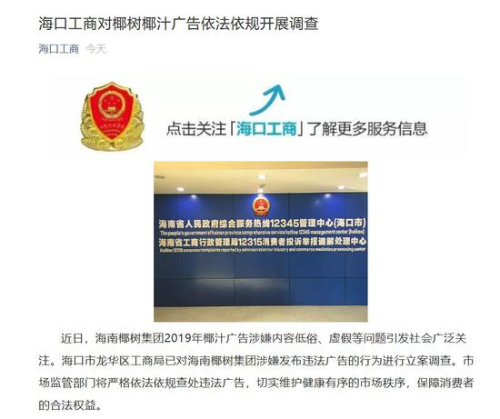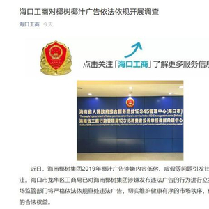 2月13日,就椰树椰汁广告恶广告涉嫌内容低俗、虚假等问题引发社会广泛关注。海口市龙华区工商局已对椰树集团涉嫌发布违法广告的行为进行立案调查。市场监管部门将严格依法依规查处违法广告,切实维护健康有序的市场秩序,保障消费者的合法权益。
