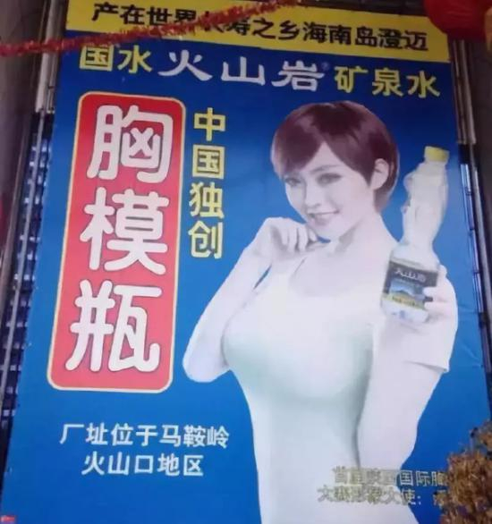 2016年,椰树集团对人体的热爱达到峰值,推出了胸模瓶火山岩深层矿泉水。