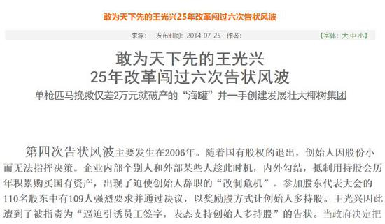 值得注意的是,同样在2006年,椰树集团发生过一次“改制危机”,一度威胁到了王光兴的地位。椰树集团对此事的描述同样采用了“被害者”的论调,将此事称为“第四次告状风波”。