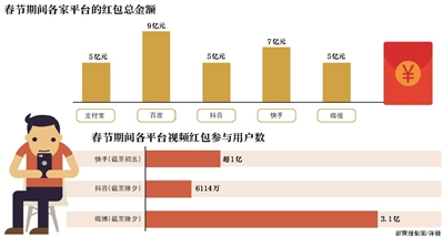 数据显示,截至正月初五,有超过1亿人参与快手抢红包活动,金额也从原计划的6亿元增加至7亿元;截至除夕,共有超过6114万用户参与抖音的“美好音符年”活动,共同分享5亿红包;有3.1亿用户参与微博“锦鲤红包”活动,其中27万人获得锦鲤红包;除夕至初二,通过微视发放的视频红包,有7809万个在微信、QQ和微视里被领取。